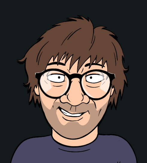Karikatur eines lächelnden Mannes mit struppigem Haar und runden Gesichtszügen.